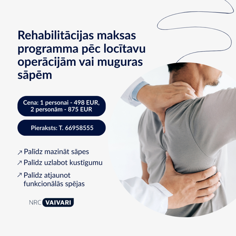 Nr. 4 (5 dienas, 4 naktis) – hronisko sāpju rehabilitācijas programmaCena: 1 personai – 515 EUR, 2 personām – 910 EUR Iekļauts: