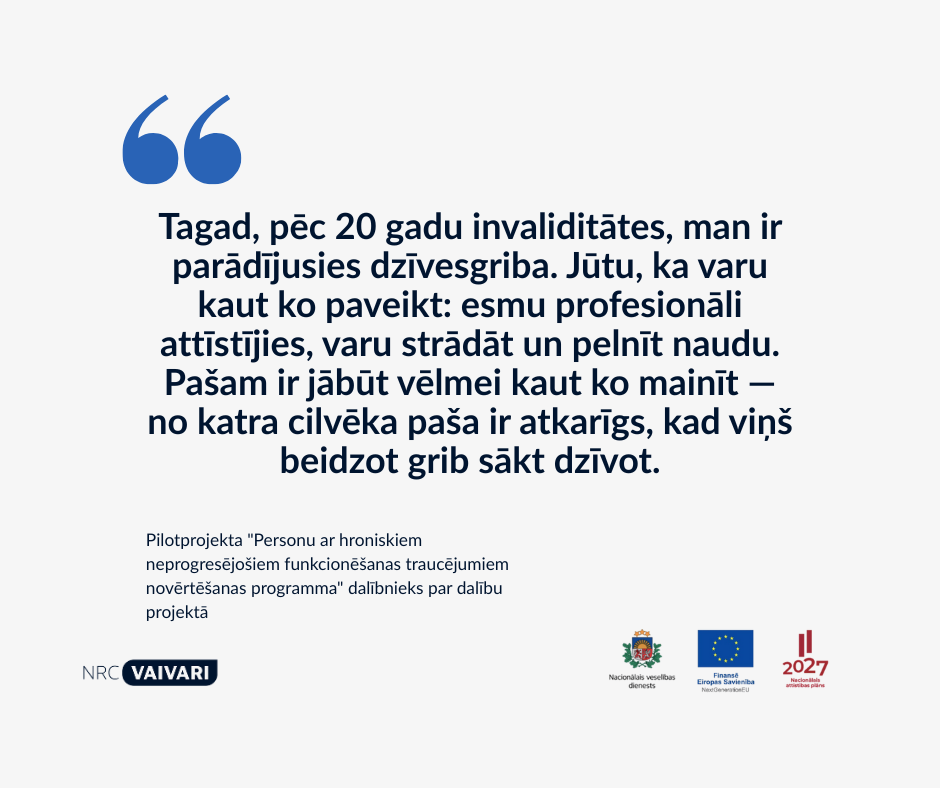 Bija jākļūst aktīvākam. Ar ārsti vienojāmies, ka mana galvenā problēma ir tā, ka esmu mazliet “iegulējies” un man pietrūkst kardio treniņu. Jau nedēļas laikā veselība mazliet uzlabojās, un tagad mājās turpinu pilotprojektā iesākto, lai uztrenētu sirdi līdz līmenim, kāds man bija pirms desmit gadiem. Pēc sarunas ar ārsti pieslēdzās arī psiholoģe, uztura speciāliste un citi speciālisti. Lielākais izaicinājums bija atrast motivāciju. Pirmajā rehabilitācijas reizē pēc avārijas vispār nesapratu, kas ar mani notiek. Otrajā reizē jau gāja mazliet labāk. Pašam ir jābūt vēlmei kaut ko mainīt — no katra cilvēka paša ir atkarīgs, kad viņš beidzot grib sākt dzīvot. Tagad, pēc 20 gadu invaliditātes, man ir parādījusies dzīvesgriba. Jūtu, ka varu kaut ko paveikt: esmu profesionāli attīstījies, varu strādāt un pelnīt naudu.