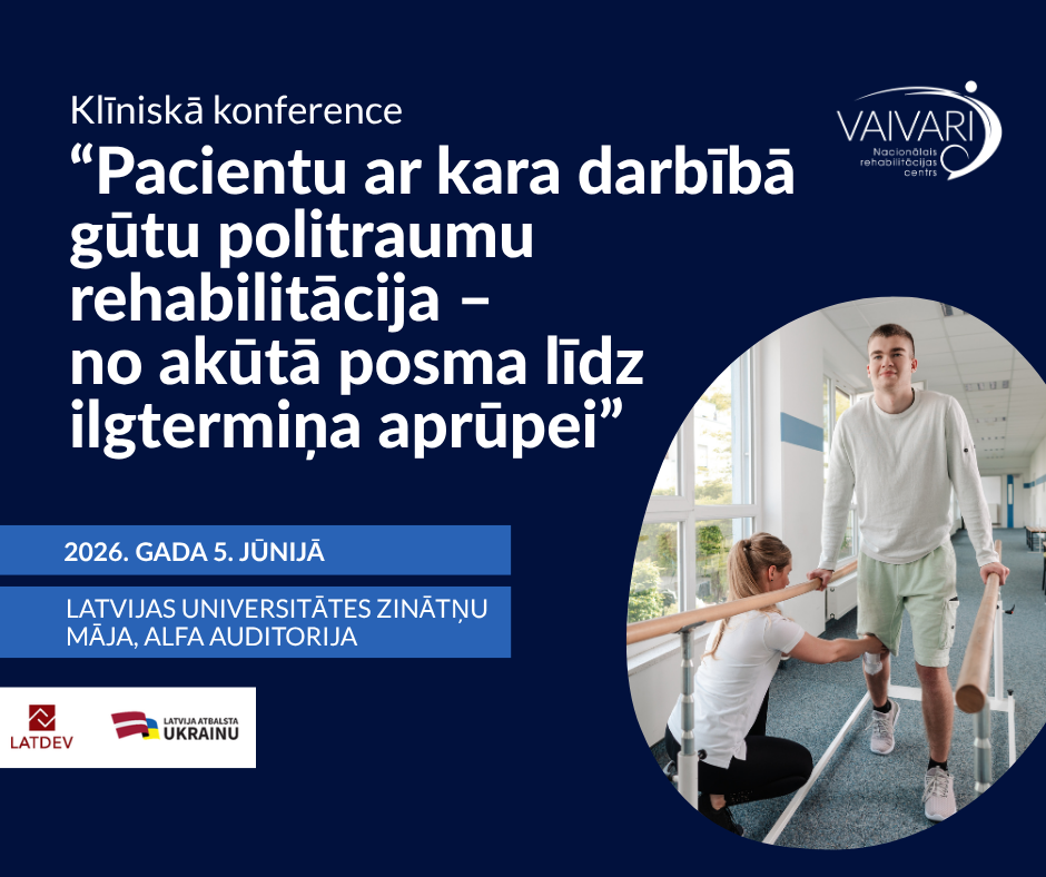 Nacionālais rehabilitācijas centrs “Vaivari” informē, ka ir atvērta reģistrācija dalībai starptautiskā klīniskā konferencē “Pacientu ar kara darbībā gūtu politraumu rehabilitācija - no akūtā posma līdz ilgtermiņa aprūpei”, un aicina interesentus pieteikties, izmantojot konferences mājaslapu: www.konference.nrcvaivari.lv. Konference notiks 2026. gada 5. jūnijā Latvijas Universitātes Zinātņu mājā Rīgā.