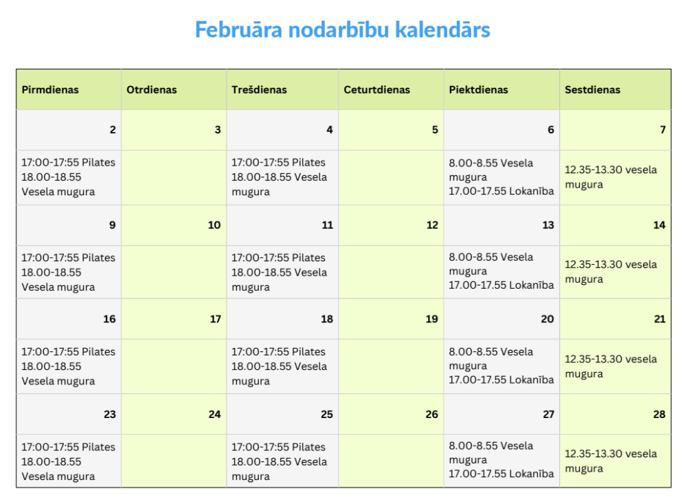 Janvāra aktivitāšu kalendārs latviešu valodā ar zaļu un baltu režģi. Katrā dienā ir uzskaitītas pilates un citas fitnesa nodarbības, tostarp tādi laika intervāli kā 17:00-17:55 Pilates un 8:00-8:55 Veskla mugura, kas sakārtoti pa nedēļām.