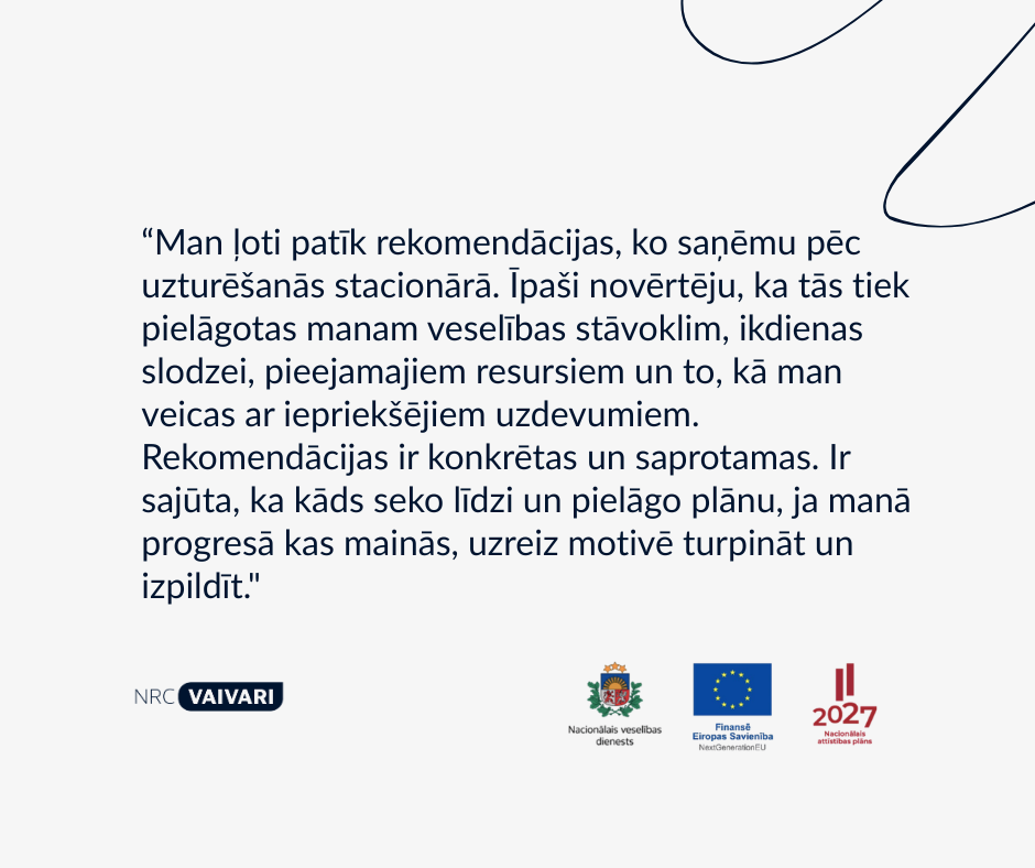 “Daudziem pacientiem pēc rehabilitācijas stacionārā pienāk brīdis, kad rodas daudz jautājumu. Trūkst gan saprotamas informācijas par nākamajiem soļiem, gan praktiska atbalsta, kā rekomendācijas īstenot ikdienā mājās. Tāpēc šajā pilotprojektā mēs īpaši vērtējam, cik skaidras un reāli ieviešamas ir sniegtās rekomendācijas, un apkopojam pacientu pieredzi, lai turpmāk atbalsts pēc stacionāra būtu mērķtiecīgāks un nepārtraukts,” NRC “Vaivari” Stacionārā dienesta virsārste Inese Svikliņa.