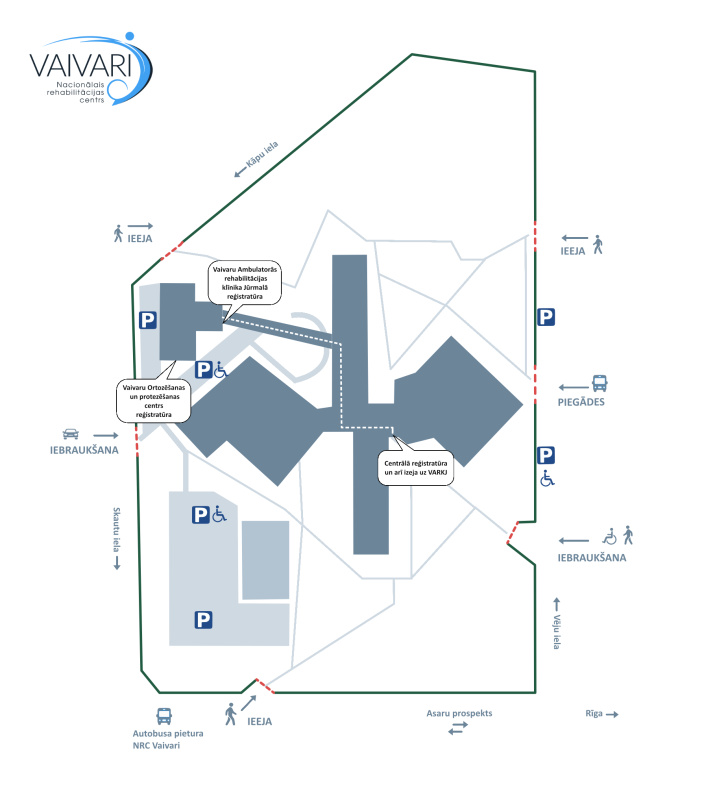 Vaivaru ambulatorās rehabilitācijas klīnika atrodas NRC “Vaivari” teritorijā, atsevišķā ēkā ar adresi Asaru prospekts 61 K1. Iebraukšana teritorijā no Skautu ielas puses.