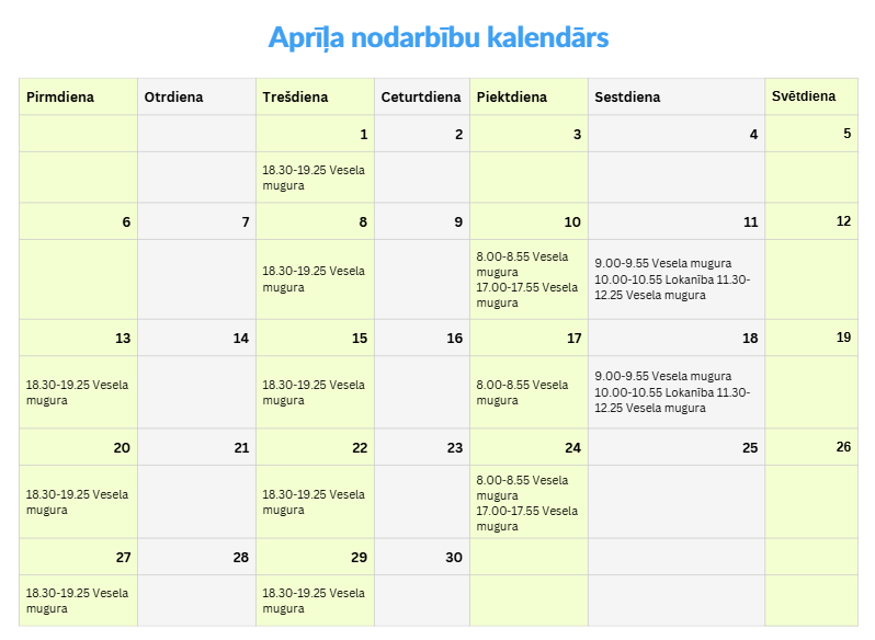 Nodarbību laiki (ar iepriekšēju pierakstu):